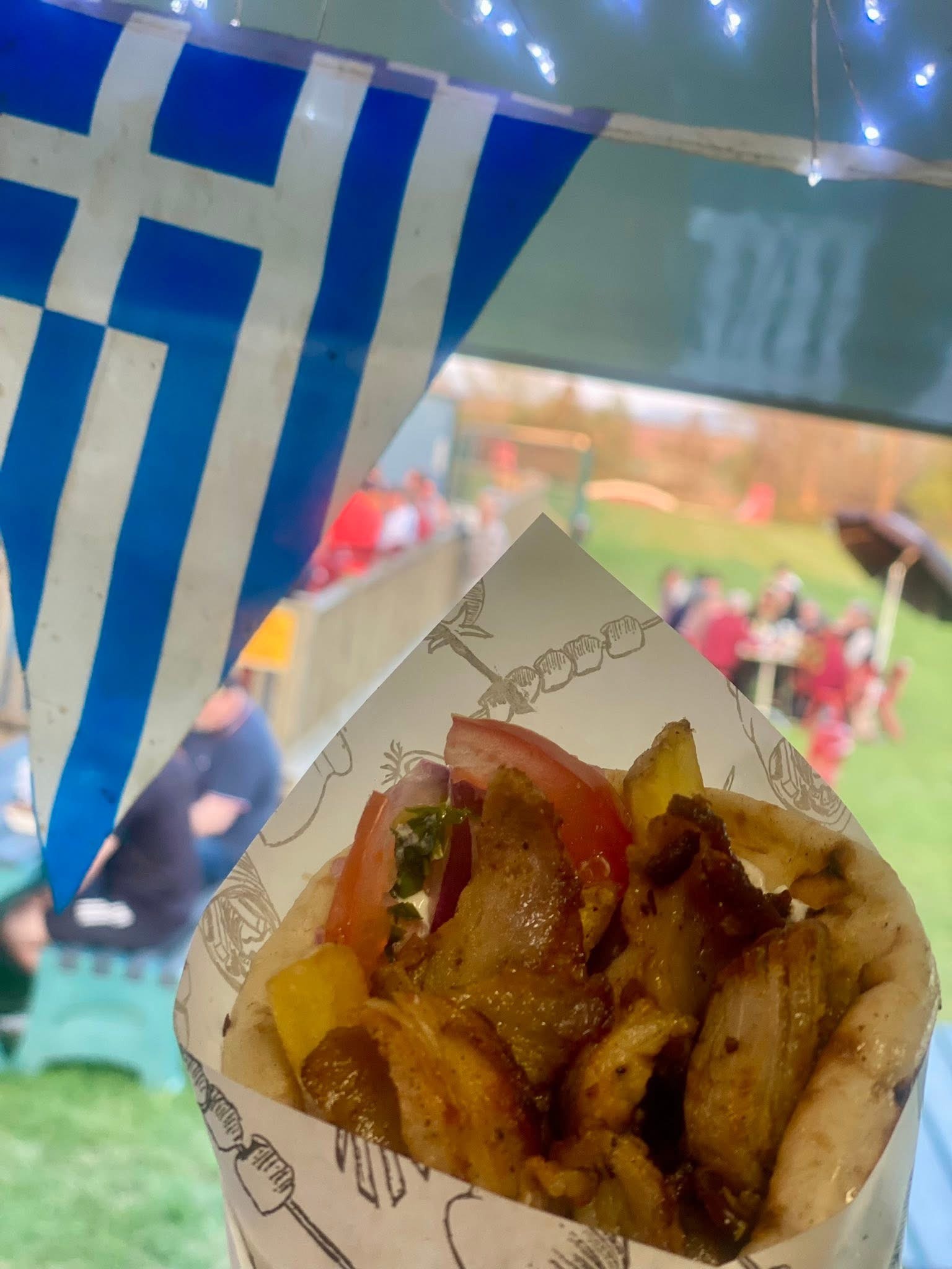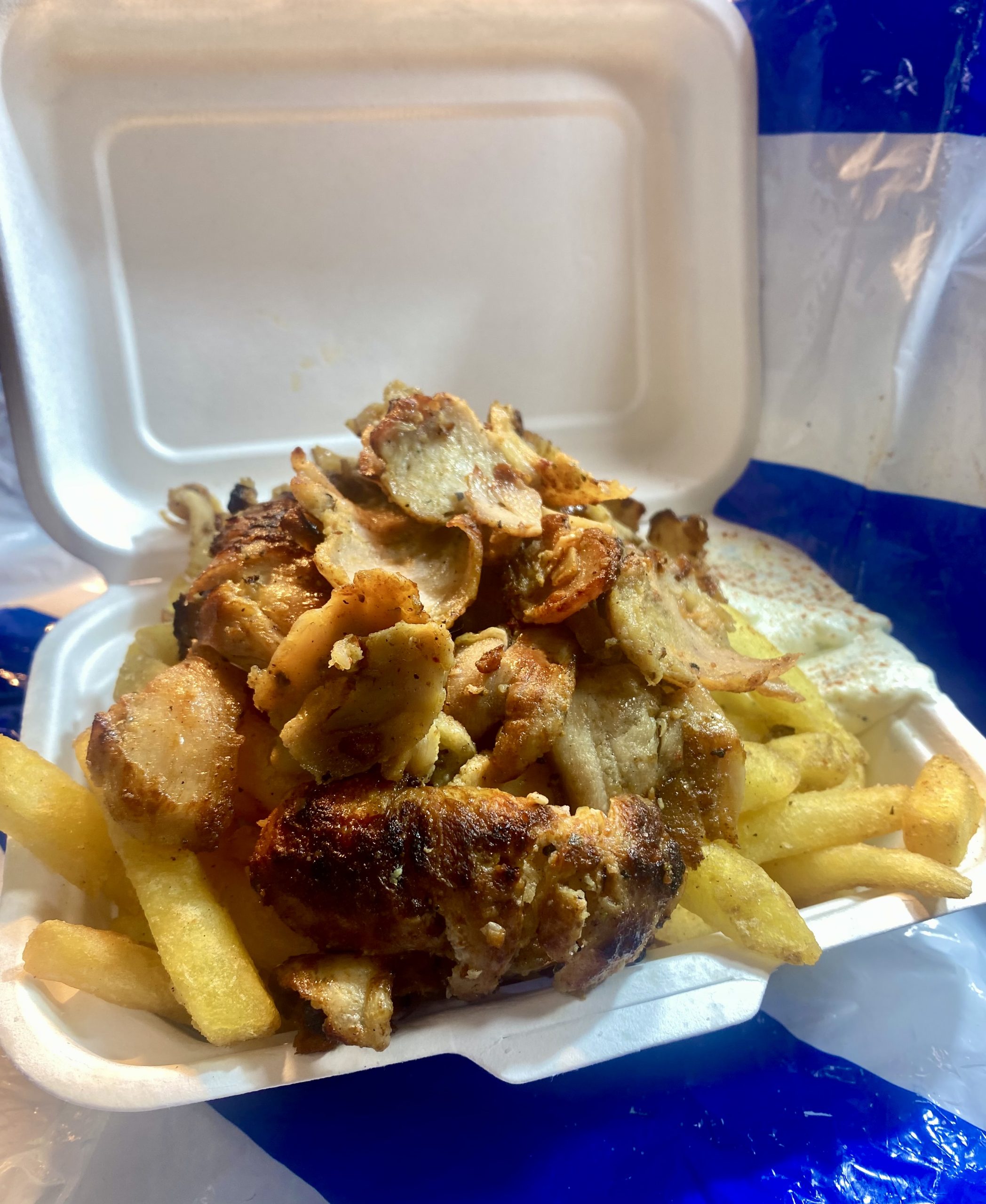 Chicken or Pork Gyro, Chips & tzatziki.