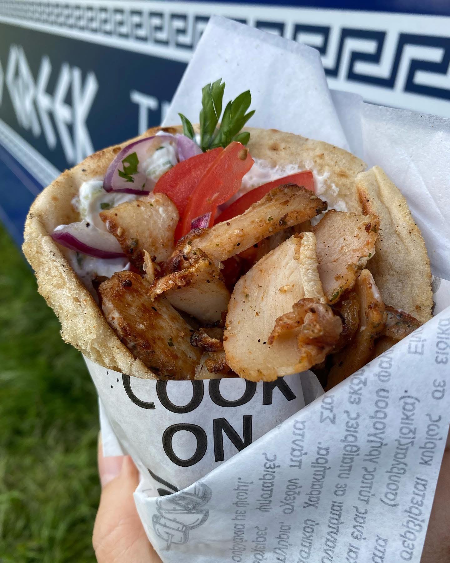 Pitta bread, tzatziki, tomatoes, onions, lettuce & chips.