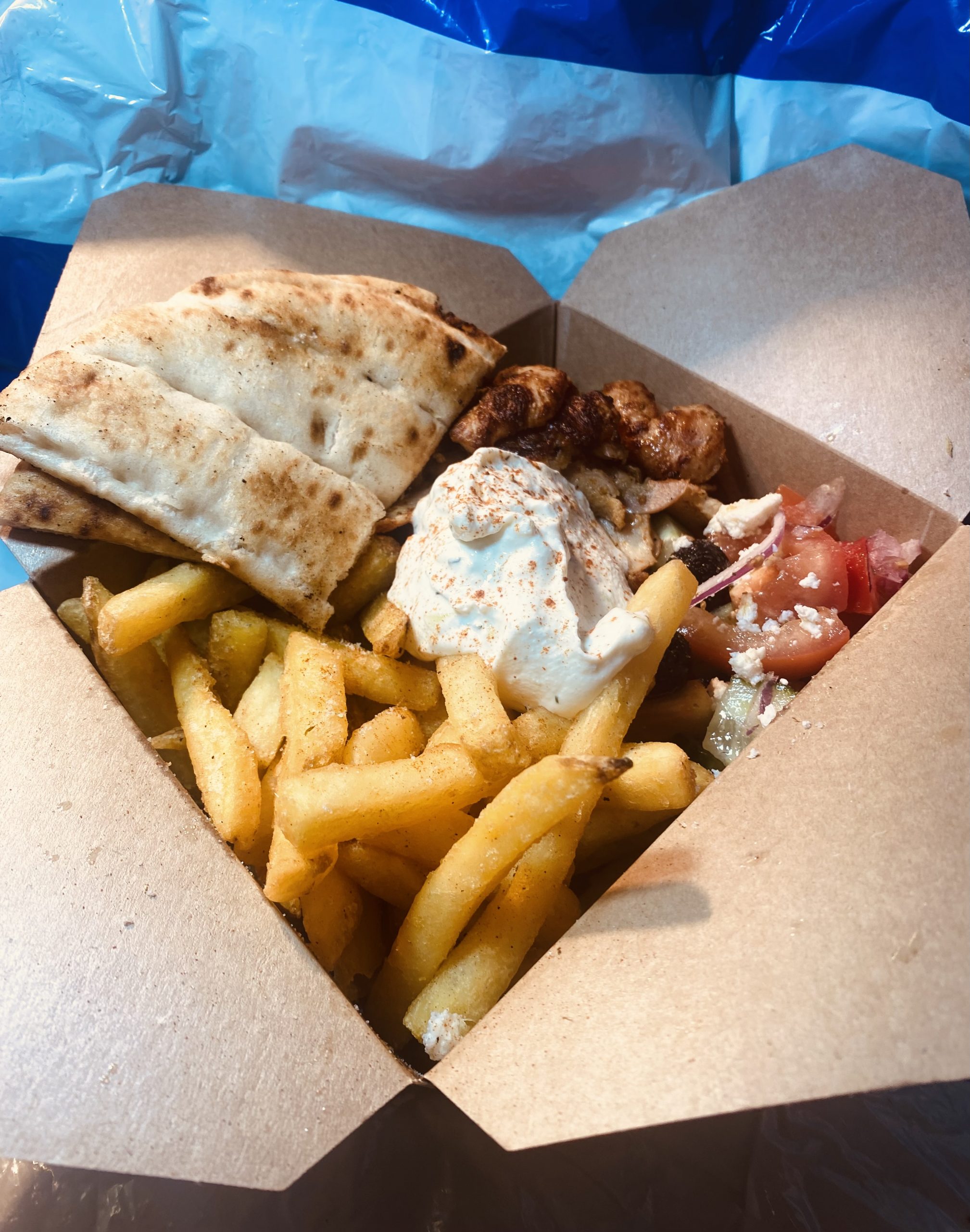 Chicken or Pork, chips, Greek Salad, tzatziki & 2 pieces of Pitta Bread.