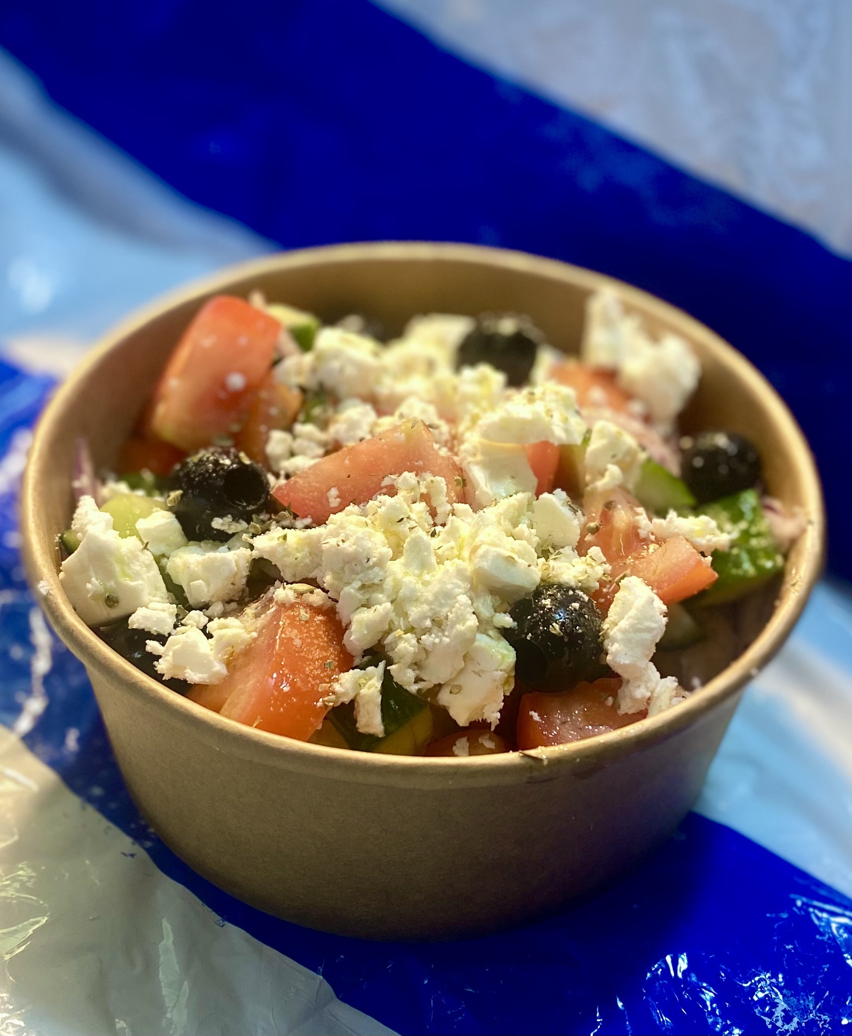 Tomatoes, Cucumbers, Onions, peppers, Feta Cheese, Olives, sprinkled with Salt & Oregano.